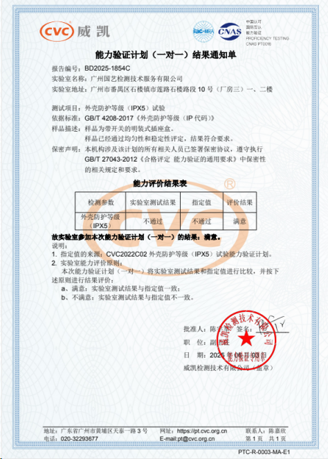 2025年5月,廣州國(guó)藝檢測(cè)技術(shù)服務(wù)有限公司(簡(jiǎn)稱國(guó)藝檢測(cè))與威凱檢測(cè)技術(shù)有限公司進(jìn)行了GB /T4208-2017《外殼防護(hù)等級(jí)(IP代碼)》項(xiàng)目能力驗(yàn)證計(jì)劃(一對(duì)一)比對(duì)。國(guó)藝檢測(cè)嚴(yán)格按照《外殼防護(hù)等級(jí)(IPX5)試驗(yàn)?zāi)芰︱?yàn)證計(jì)劃(一對(duì)一)作業(yè)指導(dǎo)書》、進(jìn)行了檢測(cè)并形成試驗(yàn)報(bào)告,最終的對(duì)比結(jié)果為滿意。