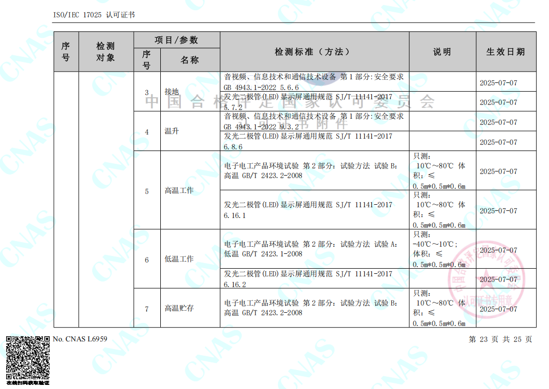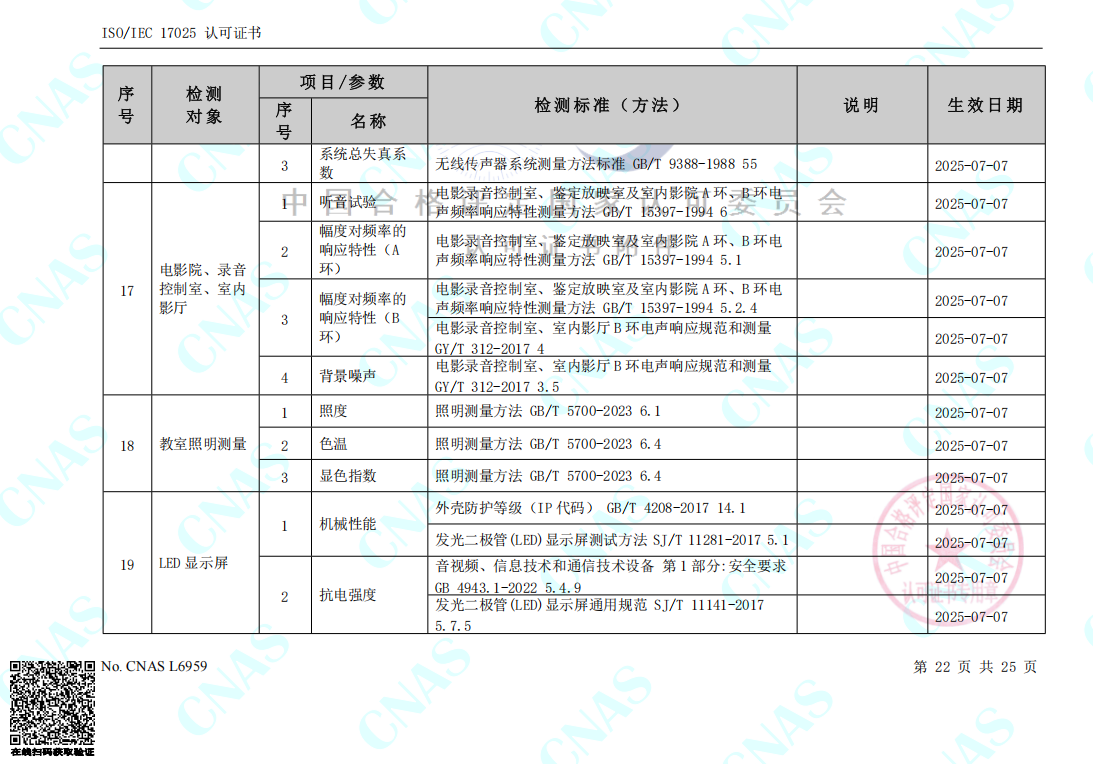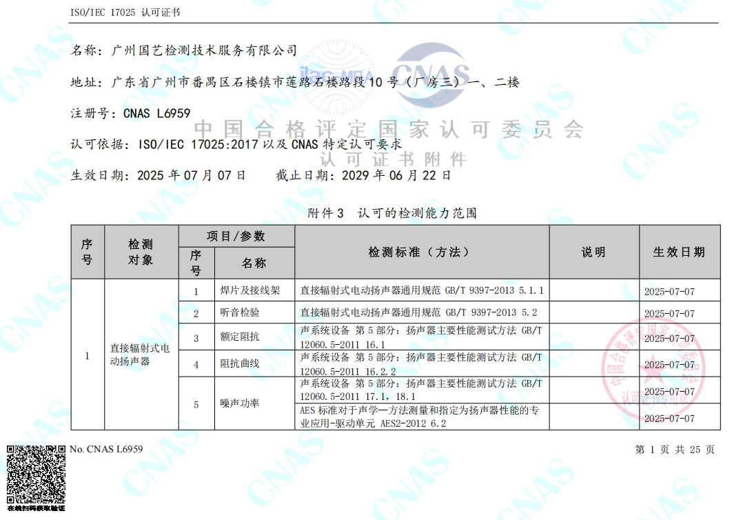 日前,廣州國藝檢測技術(shù)服務(wù)有限公司(簡稱國藝檢測)正式收到中國合格評定國家認(rèn)可委員會頒發(fā)的證書編號:CNAS L6959,ISO/IEC 17025 認(rèn)可證書以及認(rèn)可的檢測能力范圍表,從2025年7月7日起,國藝檢測獲得涉及電聲產(chǎn)品檢測、環(huán)境試驗(高低溫)、外觀防護(hù)(最高IP66)、吊掛件拉力、安全特性(抗電強度+接地電阻)、廳堂擴(kuò)聲、城市噪聲、建筑聲學(xué)、隔音量、體育場館、公共廣播系統(tǒng)、舞臺燈光系統(tǒng)、教室照明、電影院、LED顯示屏以及視頻顯示系統(tǒng)等20個領(lǐng)域的CNAS認(rèn)可檢測資質(zhì),標(biāo)志著國藝檢測正式發(fā)展成為聲光電系統(tǒng)集成一體化第三方檢測機構(gòu)。